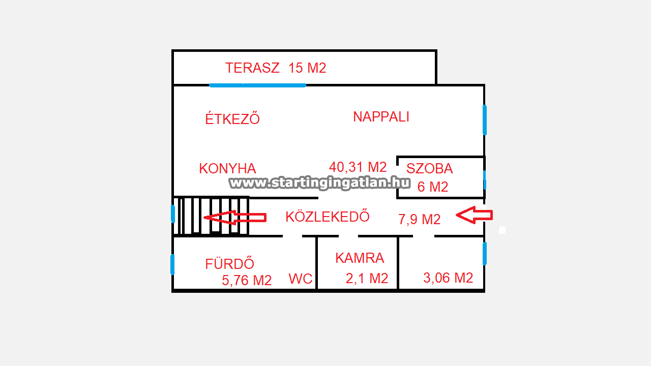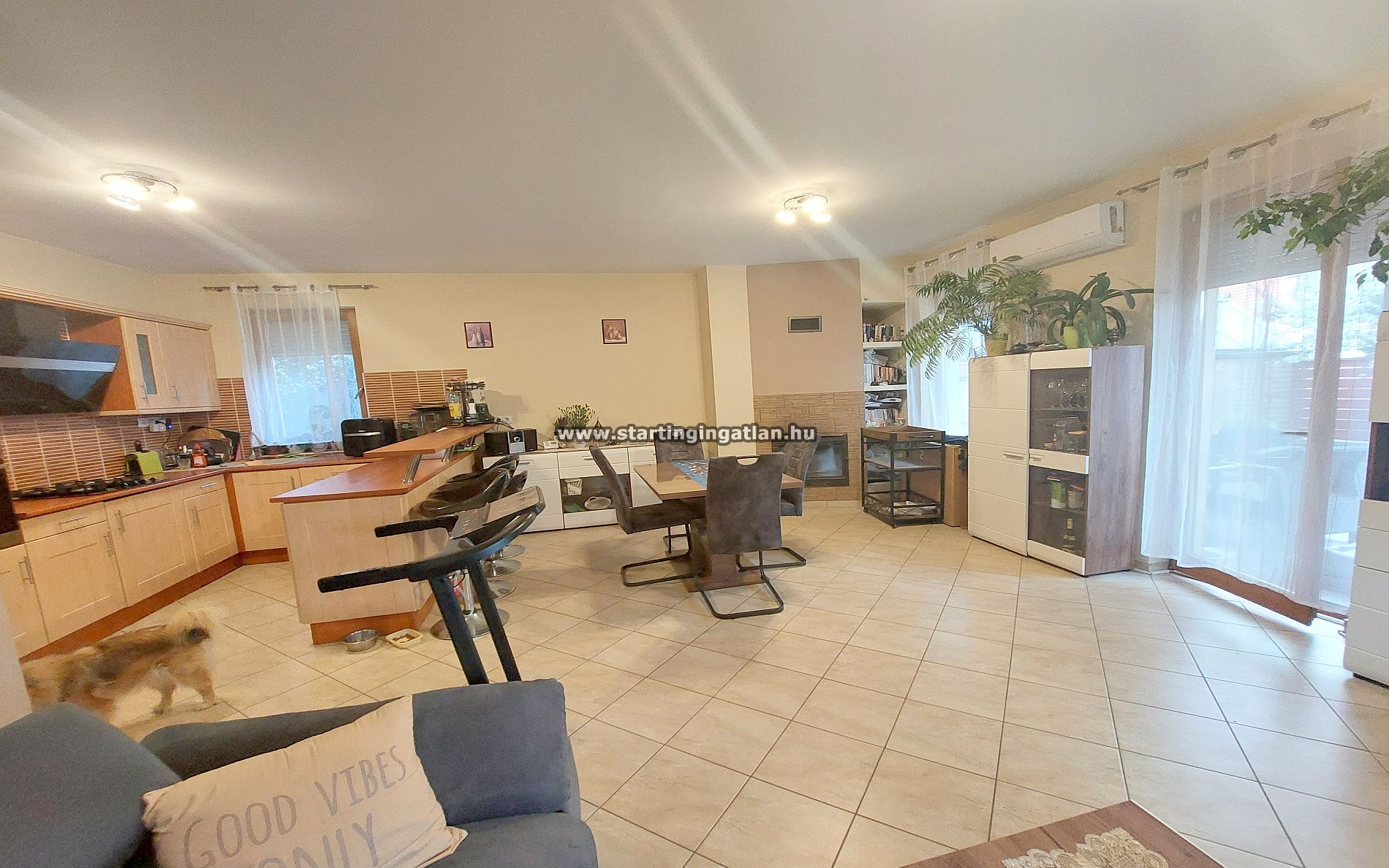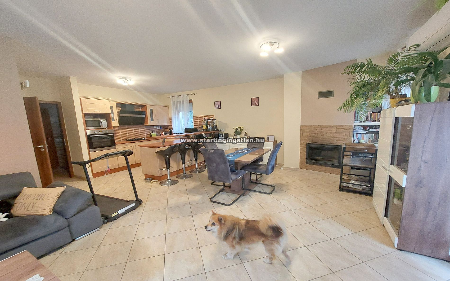 Az ingatlan egyik legnagyobb erőssége a világos, élhető terek harmóniája. A földszinten található amerikai konyhás nappali tágas, napfényben úszó központi élettér, amely közvetlen kapcsolatban áll a 15 m²-es terasszal. A praktikus elrendezés része egy sokoldalúan hasznosítható szoba is, amely igény szerint dolgozószobaként vagy hálóként funkcionálhat, de akár könnyedén alakítható is, köszönhetően a gipszkarton falazatnak.